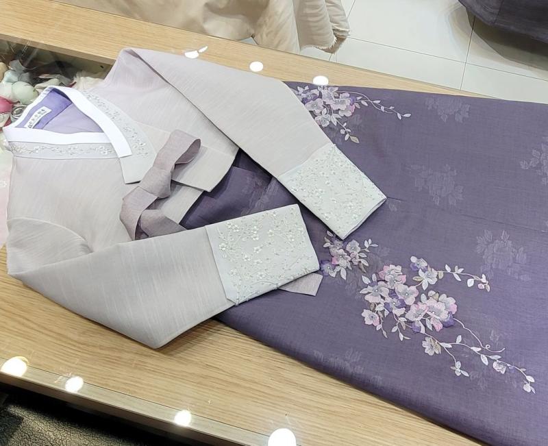 치마 자수가 정말 아름다운 여성한복 디자인이에요!고급진 원단을 사용해서 너무 쨍하지 않고 차분한 보라색이랍니다. 하객한복 으로 많이 대여하시는 디자인이에요~