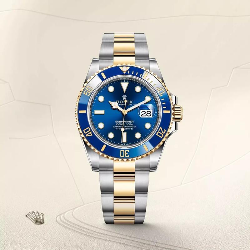 다이버 워치의 대명사. 오이스터 브레슬릿, 로열 블루, 41mm 케이스, 옐로우 롤레조 소재의 롤렉스 Submariner Date. Rolex Submariner