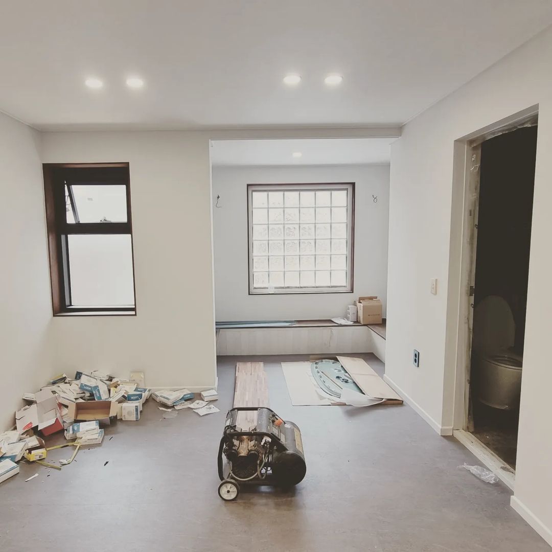 페인트 느낌의 실크 벽지,바닥타일 작업완료