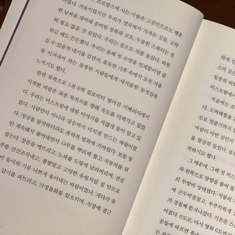 "시베리아에서 시작된 바람은 최종 목적지를 향해 속도를 더해가고 있었다. 우리는 미스트랄에 대한 이야기를 적잖게 들어 알고 있었다. 사람만이 아니라 짐승까지 미치게 만드는 바람이었다. 정상을 참작하더라도 폭력적 범죄에 가까웠다. 보름 동안 계속해서 불어대면서 나무를 뿌리째 뽑고 자동차를 뒤집는다. 창문을 깨뜨리고, 노파를 도랑에 날려버리며, 전신주를 산산조각내고, 쌀쌀맞고 고약한 유령처럼 집 안으로 숨어 들어와 기분 나쁘게 울어대는 바람이었다."