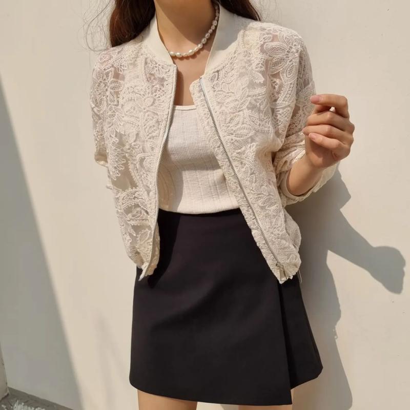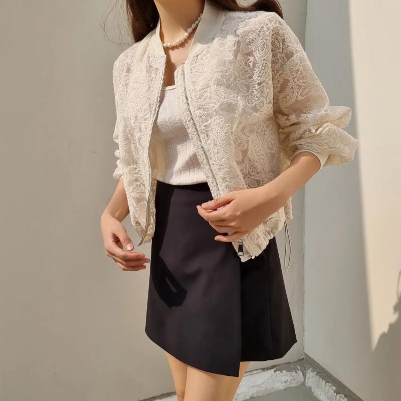 우아함과 여성스러움을 품고 있는 레이스 오간자 소재감과 캐주얼무드가 느껴지는 블루종 디자인이 만나 다양하게 스타일링 하기