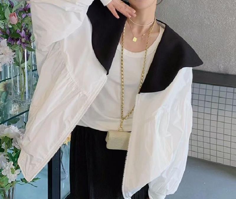 배색 빅카라 프릴 어깨 퍼프 봄 여름 가을 루즈핏 빅사이즈 화이트 긴팔 점퍼는 다양한 계절에 활용할 수 있는 바람막이 아이템입니다.