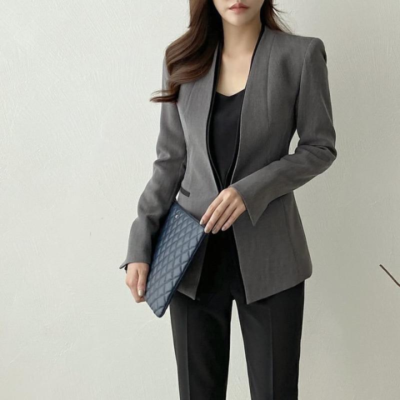 슬림라인의 노카라 스판 자켓 디자인으로 버튼 없이 속에