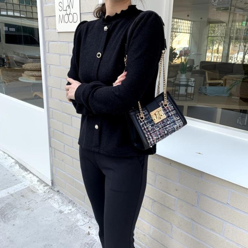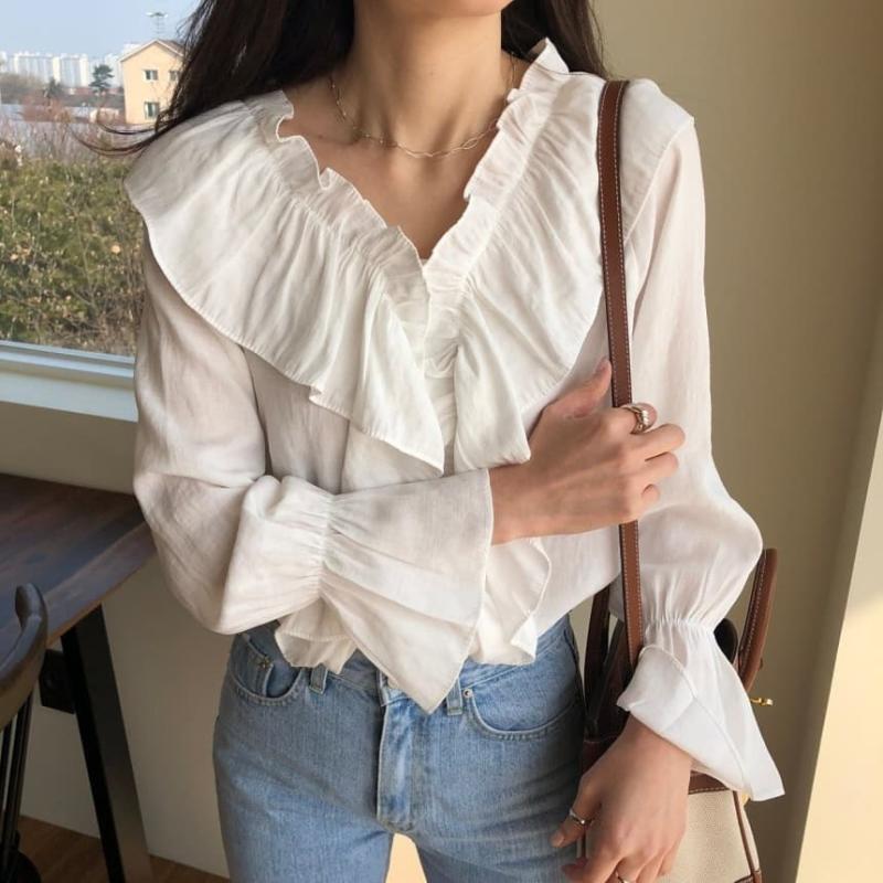 풍성한 프릴이 열일하는 블라우스! 프릴프릴한 넥라인도 넘 이쁘구요~ 아우터를 입어도 풍성한 프릴이 살짝보이면서 여성여성해요☺️ 넣입빼입 다 가능하구요. 풍성한 프릴이 뱃살을 쏙 감춰주니까 77까지 추천드려요👍