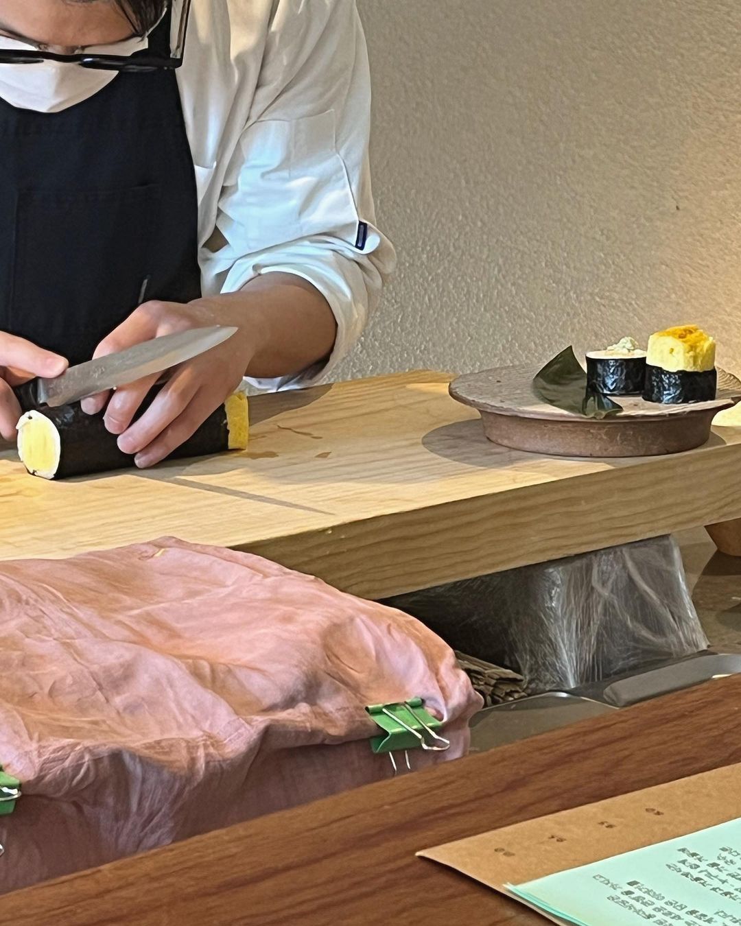 마치 오마카세 식당 처럼 배열된 테이블에, 앞에서 쉼없이 👨🏻🍳계란김밥을 만드시는 모습을 볼 수 있어 좋았습니다. 서빙하시면서 메뉴 하나하나 먹는 방법을 친절하게 설명해주시는 것도 좋았습니다.