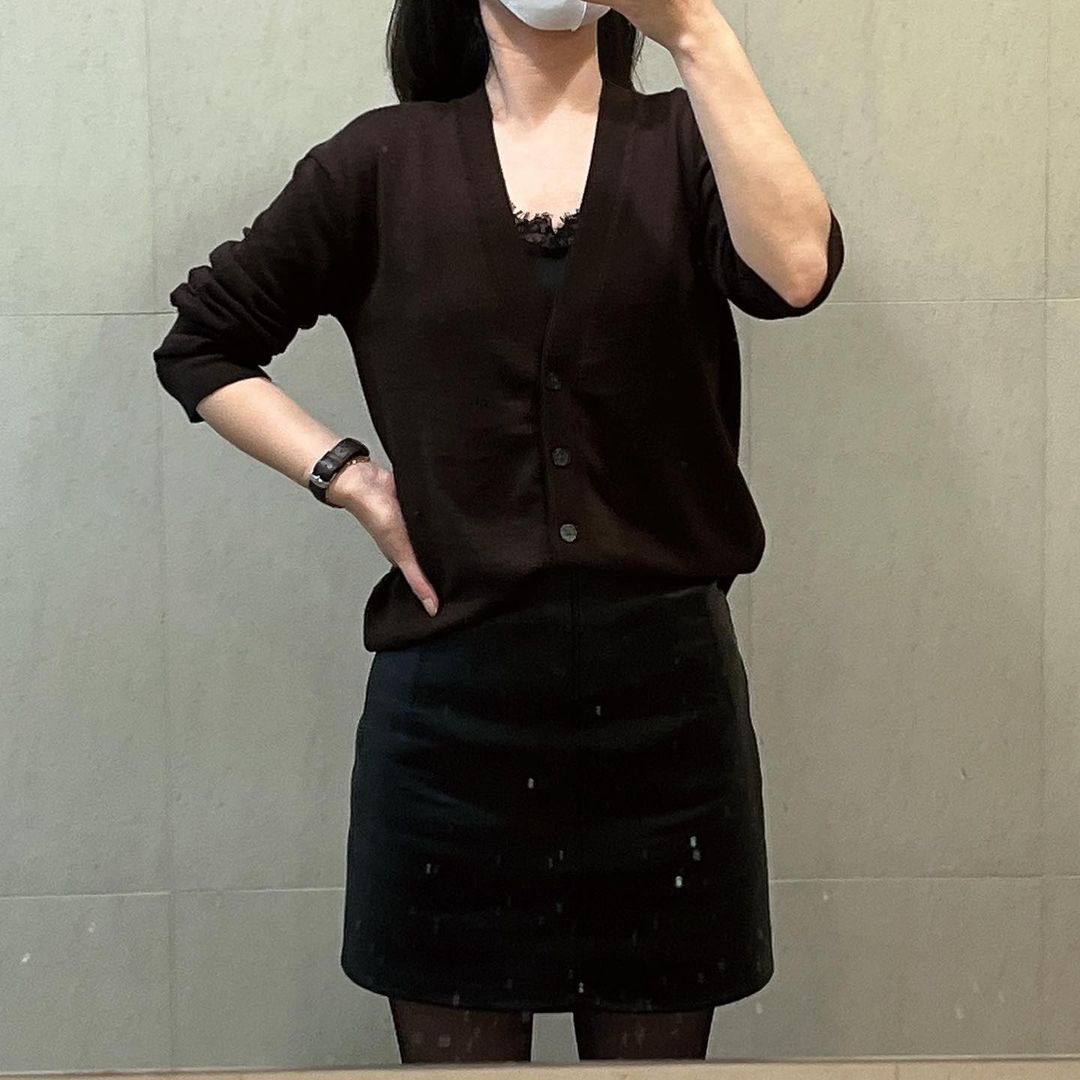 오늘은 어두운 갈색 가디건에 빈티지샵에서 득템한 가죽 스커트를 매치해보았어요! 목이 좀 추워보이지만 출퇴근길엔 머플러를 둘러서 춥진 않았습니다😛