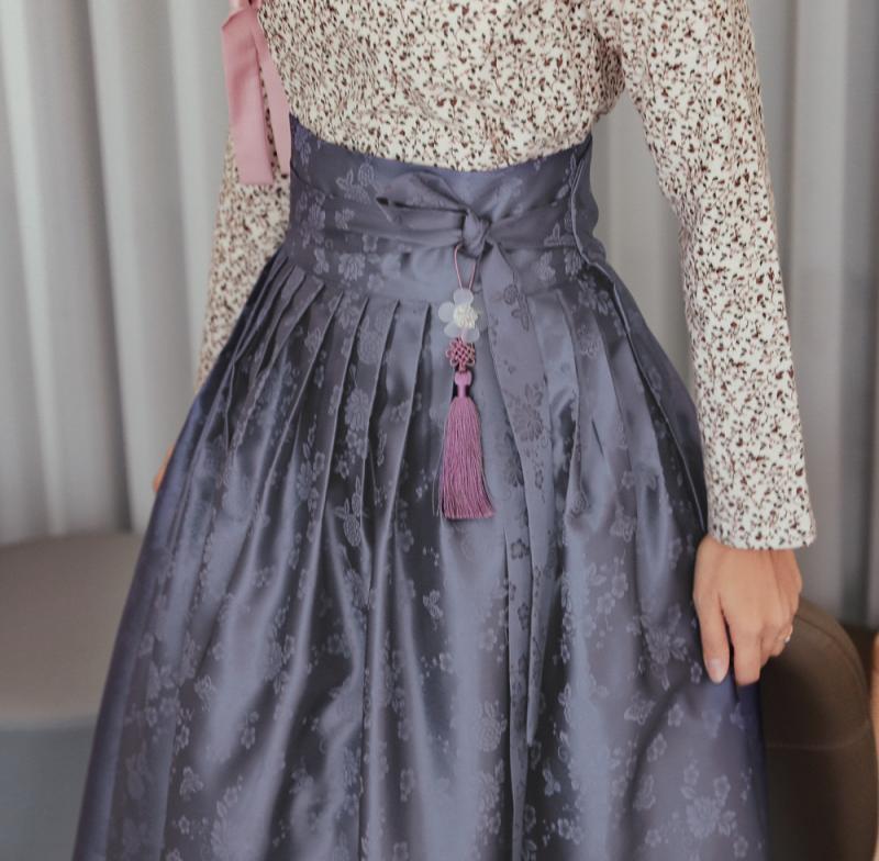 진한 차콜바탕에 보라와 핑크의 커다란 꽃잎이 겹겹히 피는것이 풍요롭고 신비하게 느껴지는 매력적인 한복입니다