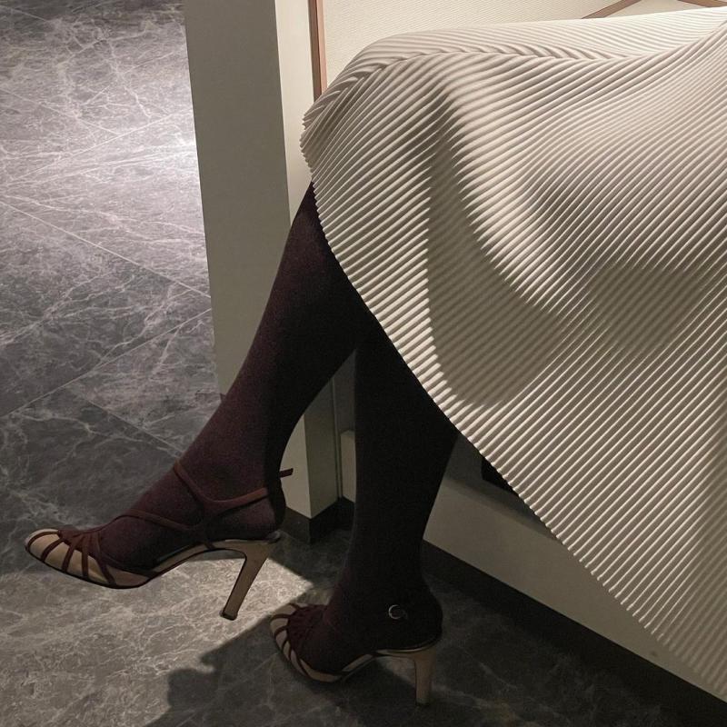 Cream을 앞부분으로 입었구요, 와인컬러 도톰한 스타킹과 샌들을 매치 하였어요.. ✨!